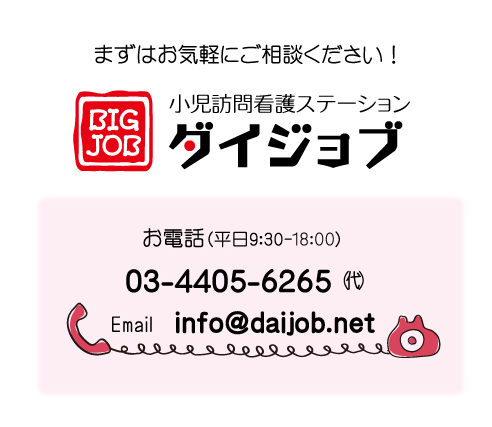 育児の中心となるお母さん、お父さんの心身のケア、ご家族が持つ不安などもお聞きし、お家でのお子さまの状況を見て医療ケアの方法を一緒に考えていきます。 また、きょうだい児の成長も大切に関わらせていただきます。